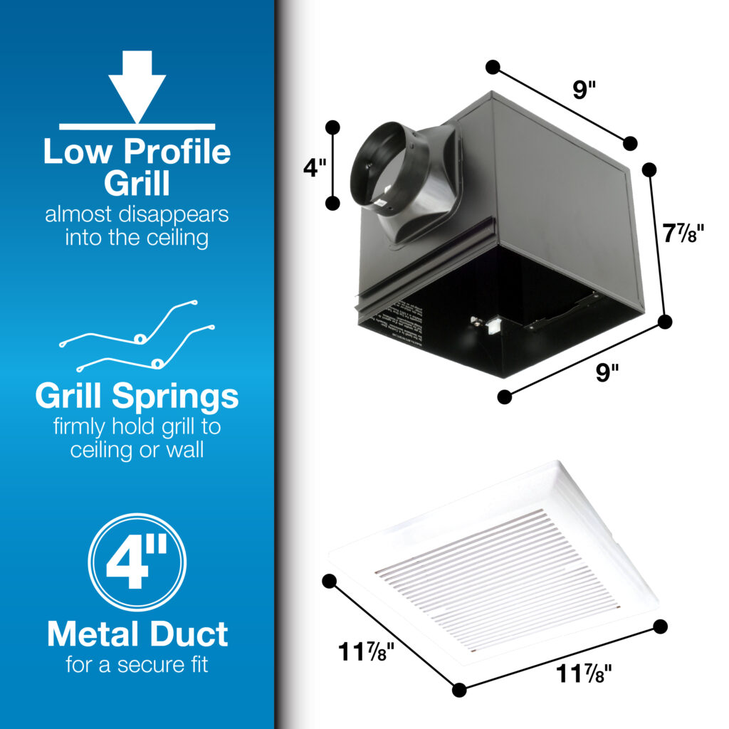 Air King’s ENERGY STAR® certified BFC quiet exhaust fans provide quiet, effective and affordable ventilation for your bathroom, laundry room or other areas of the home needing ventilation. The energy efficient motor is suitable for continuous operation and can be used to comply with ASHRAE 62.2 standards. The unit easily installs using the included adjustable hanging brackets and the 4 inch round metal duct connector with damper protects against backdrafts. The white, low profile plastic grill is unobtrusive and complements almost all decors. The fans are UL listed for installation over a tub or shower on a GFCI circuit and are HVI Certified. Perfect for use in mid size to larger bathrooms.